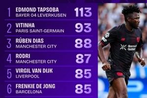 體育資訊9月19日訊 歐冠首輪今日全部戰(zhàn)罷,據(jù)Squawka的數(shù)據(jù)統(tǒng)計(jì),勒沃庫(kù)森后衛(wèi)塔普索巴完成113次傳球,傳球準(zhǔn)確率93%,另外他是本輪唯一完成傳球次數(shù)100+的球員。