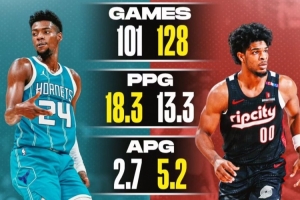 美媒Cluthpoints曬圖,對比了2023年榜眼米勒和探花亨德森的數(shù)據(jù),米勒出戰(zhàn)101場,場均18.3分2.7助攻4.4籃板,命中率42.8%,亨德森出戰(zhàn)128場,場均13.3分5.2助攻3.1籃板,命中率40.1%,并寫道: