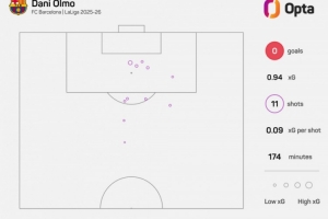 本賽季,奧爾莫在西甲中11腳射門均未能破門得分。在沒有取得進球的球員中,僅伊納基-威廉姆斯和阿斯普里拉所用射門次數(shù)更多。
