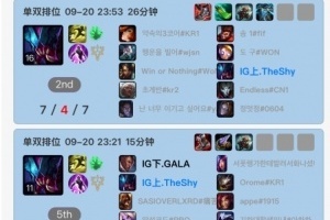 體育資訊9月22日訊 根據(jù)韓服排位統(tǒng)計小程序顯示,iG選手五人近日在韓服加練,GALA、Wei加練至今日凌晨兩三點(diǎn),Theshy狂玩上單挖掘機(jī)。