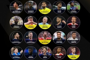 登貝萊(巴黎)、哈蘭德(曼城)、若奧-內(nèi)維斯(巴黎)、貝林厄姆(皇馬)、萊萬(wàn)(巴薩)