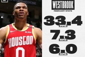 接著NBA Memes曬出了2020年2月搭伙哈登時(shí)的威少的月數(shù)據(jù),場(chǎng)均33.4分7.3板6助攻,投籃命中率為54.9%。