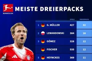 體育資訊09月23日訊 德轉(zhuǎn)統(tǒng)計(jì)了德甲歷史帽子戲法榜,蓋德穆勒32次帽子戲法斷層領(lǐng)先,凱恩僅用67場就排在歷史第7。