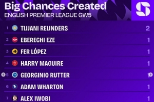 體育資訊9月24日訊 英超第5輪戰(zhàn)罷,squawkafootball列各項數(shù)據排行,賴因德斯共創(chuàng)造2次重大機會,本輪最多。