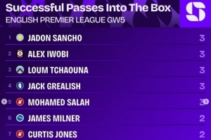 體育資訊9月24日訊 英超第5輪戰(zhàn)罷,squawkafootball列各項數(shù)據(jù)排行,桑喬等5名球員3次成功將球傳入禁區(qū),為本輪聯(lián)賽最多。