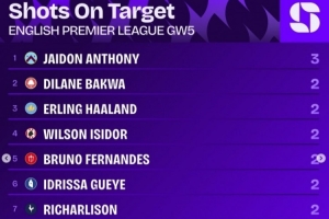 體育資訊9月24日訊 英超第5輪戰(zhàn)罷,squawkafootball列各項(xiàng)數(shù)據(jù)排行,伯恩利前鋒杰頓-安東尼是射正次數(shù)最多的球員,共3次。