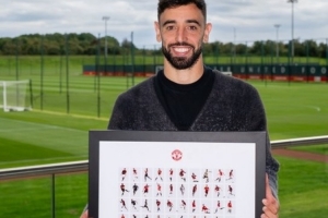 曼聯(lián)官方社媒曬圖,B費獲得100球的紀念品,一個由100個B費卡通圖案組成的紀念框。