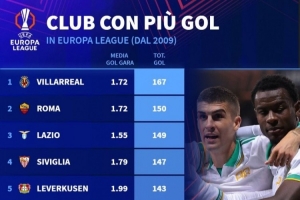 1、比利亞雷亞爾:167球,場(chǎng)均1.72球