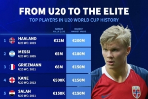 1.哈蘭德(2019年參加U20世界杯):1200萬(wàn)歐元(參加U20世界杯時(shí)的身價(jià))→2億歐元(生涯迄今最高身價(jià))