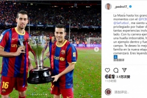 佩德羅社媒曬出與布斯克茨的捧杯合照,寫(xiě)道:“一位足球巨星宣布退役,感謝布斯克茨為我們奉獻(xiàn)的精彩足球!