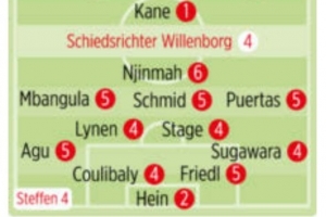 體育資訊9月27日訊 德甲第5輪比賽,拜仁主場(chǎng)4-0擊敗不萊梅,德國(guó)媒體《圖片報(bào)》為兩隊(duì)球員評(píng)分,若納坦-塔、凱恩、迪亞斯1分最高。