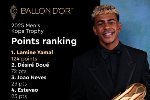 體育資訊9月27日訊 金球獎官方公布了男子科帕獎的得分細(xì)節(jié),其中亞馬爾124分成功衛(wèi)冕,以52分的優(yōu)勢領(lǐng)先于獲得72分的杜埃,科帕獎由歷屆金球獎得主投票選出?!蛾爤蟆穲蟮?,古利特是唯一未將第一順位投給亞馬爾的評委。