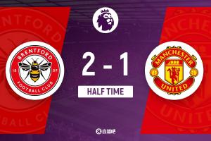 上半場(chǎng)傷停補(bǔ)時(shí)4分鐘,半場(chǎng)結(jié)束,曼聯(lián)暫1-2布倫特福德。