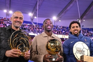 登貝萊在獲得金球獎,馬爾基尼奧斯作為隊長則拿著巴黎的最佳男足俱樂部獎,恩里克則獲得蘇格拉底獎,巴黎官推曬出三人三獎杯的合影并寫道:“集體的力量。”