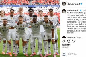 本場(chǎng)比賽受傷的卡瓦哈爾也在社媒曬出全隊(duì)合影鼓勵(lì)球隊(duì),配文寫(xiě)道:“這不是我們想要的結(jié)果。我們需要改進(jìn)的地方還有很多,我們首先要進(jìn)行自我反省。接下來(lái)的路就是繼續(xù)努力,從錯(cuò)誤中學(xué)習(xí),并以更強(qiáng)的姿態(tài)重新站起來(lái)。賽季還很漫長(zhǎng),還有很多目標(biāo)需要實(shí)現(xiàn)。Hala Madrid! ”