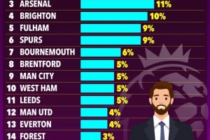 調(diào)查結(jié)果揭示了明顯的南北著裝差異,榜單前七名均被來(lái)自倫敦和南部的球隊(duì)包攬。曼城、利茲聯(lián)、布倫特福德和西漢姆聯(lián)以5%的數(shù)據(jù)并列第八。