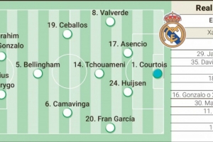 據(jù)《阿斯報(bào)》預(yù)測(cè)首發(fā)為:庫(kù)爾圖瓦;巴爾韋德、勞爾-阿森西奧、赫伊森、弗蘭-加西亞;瓊阿梅尼、卡馬文加、塞巴略斯、貝林厄姆;迪亞斯或貢薩洛、維尼修斯或羅德里戈。