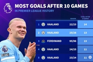 英超前10輪進(jìn)球榜:前五哈蘭德占四席,22-23賽季14球歷史最多