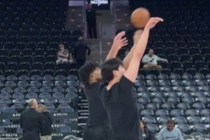 練起來(lái)!楊瀚森賽前和夏普一起進(jìn)行三分投籃熱身