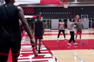 哈登造波斯特三分犯規(guī) 勇士果斷選擇挑戰(zhàn)并成功 改為中圈爭(zhēng)球