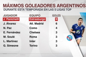 本賽季五大聯(lián)賽阿根廷射手榜:帕尼切利8球領(lǐng)跑,小蜘蛛6球次席
