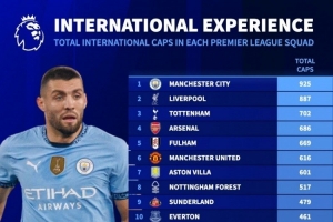 英超各隊球員國家隊出戰(zhàn)場次榜:曼城925場居首,利物浦887場次席