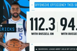 還用弗拉格打1?拉塞爾在場(chǎng)時(shí)獨(dú)行俠進(jìn)攻效率112.3 下場(chǎng)后為94.7